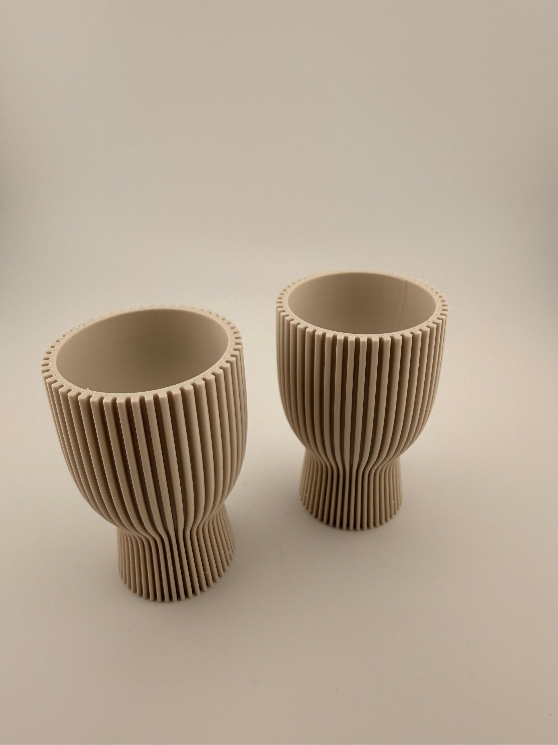 Die vertikalen Rippen strukturieren die Oberfläche gleichmäßig und erzeugen ein lebendiges Spiel aus Licht und Schatten. Der sanfte Übergang zwischen Fuß und Schale wirkt fließend und ausgewogen, wodurch Sola trotz seiner klaren Linien weich und harmonisch erscheint.