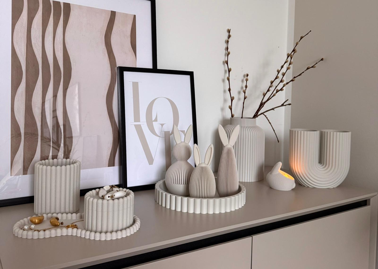 Durch präzise 3D-Druckfertigung wirkt „Hjori“ gleichzeitig minimalistisch und detailreich – ein stilvoller Blickfang auf Sideboards, Regalen oder als besondere Geschenkverpackung für kleine Aufmerksamkeiten. Ganzjährig einsetzbar, mit besonderem Charme zur Osterzeit.
