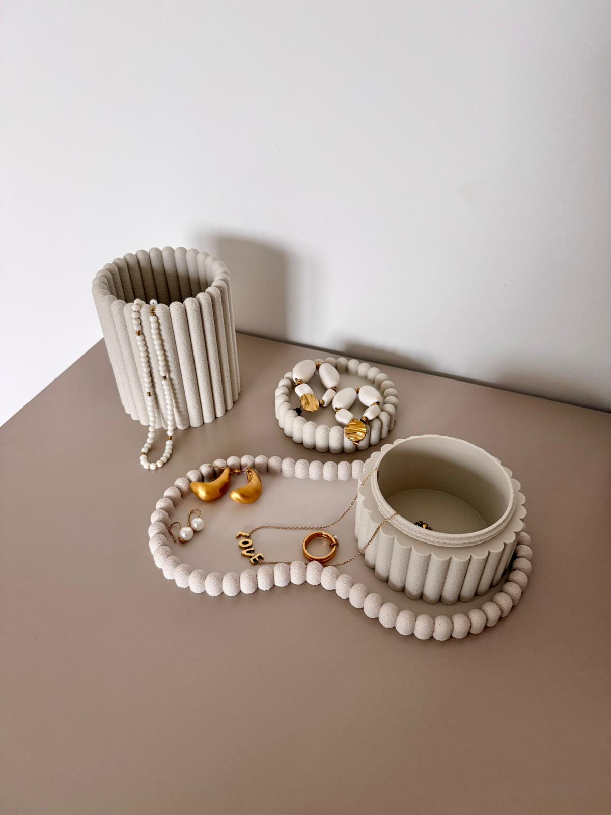 Organizer „Rivel“ zeigt eine ruhige, kreisbasierte Formensprache, bei der weich gerundete Vertikalen auf eine klare Grundordnung treffen und eine harmonische Gesamtkomposition entstehen lassen.