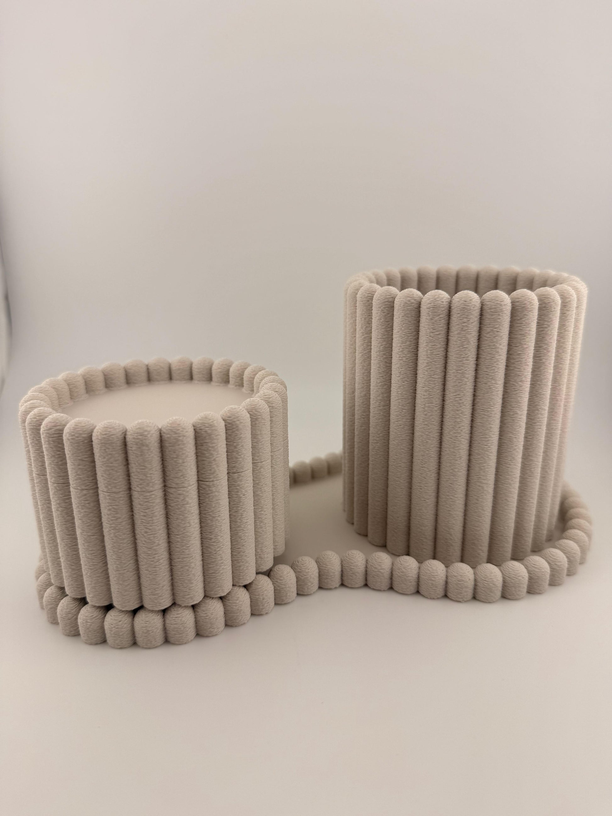 Die fein strukturierte Oberfläche mit gleichmäßig verlaufenden Rippen verleiht den einzelnen Elementen Tiefe und eine angenehme Haptik. Durch die abgerundeten Kanten entsteht ein sanftes Spiel aus Licht und Schatten, das Rivel trotz seiner Struktur ruhig und ausgewogen wirken lässt.