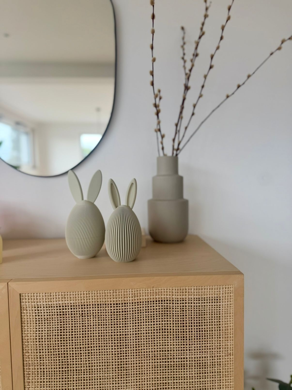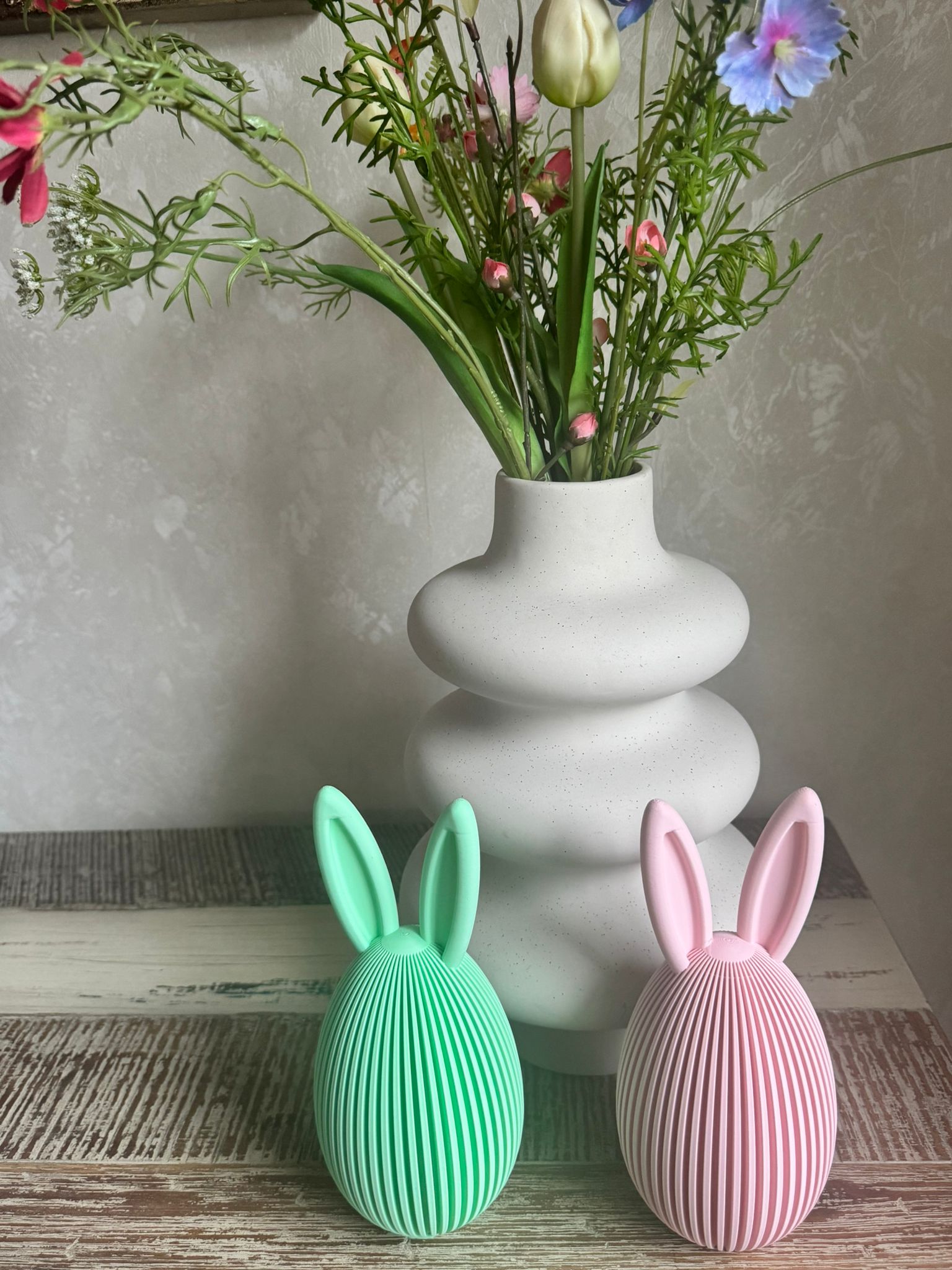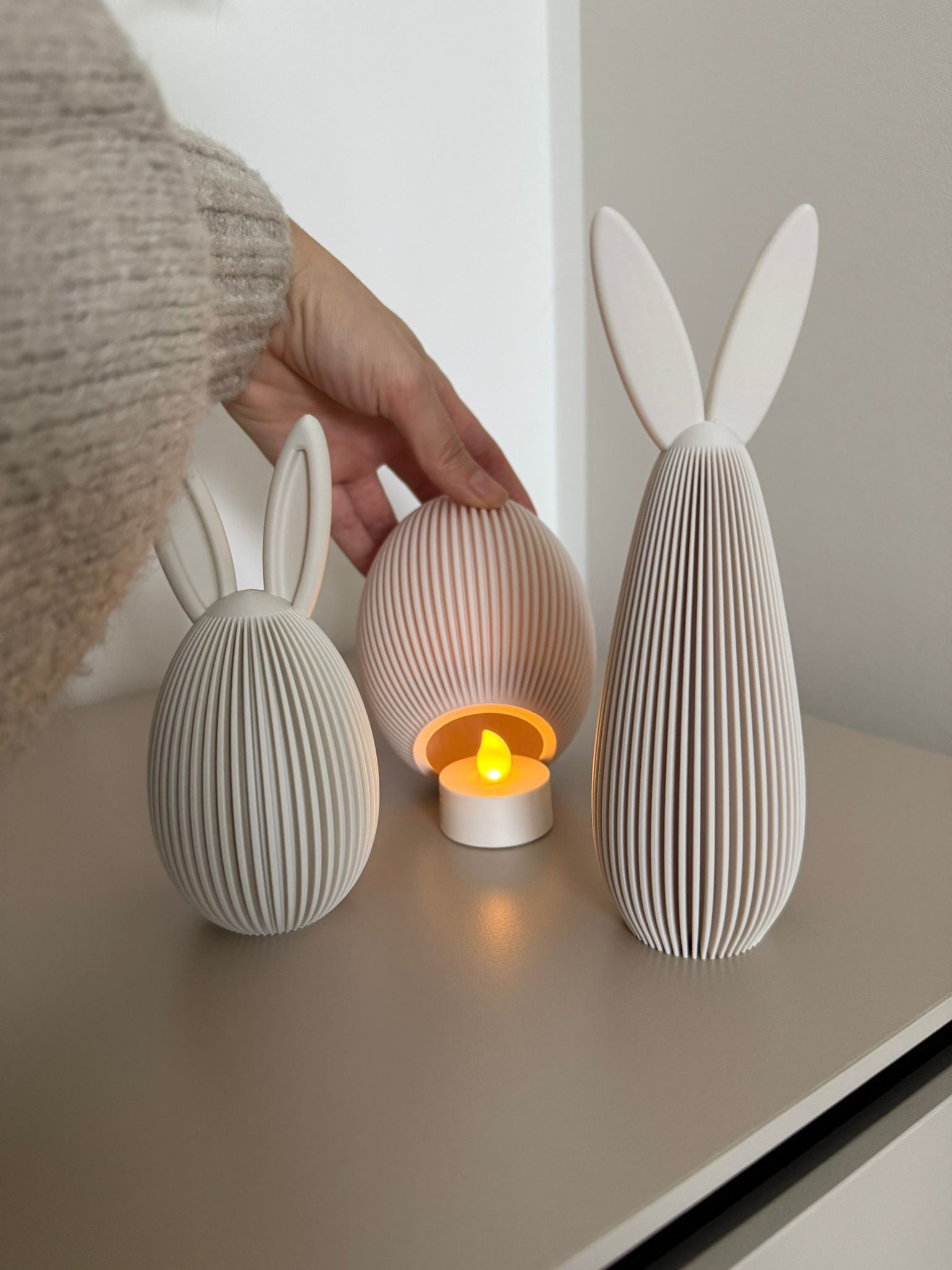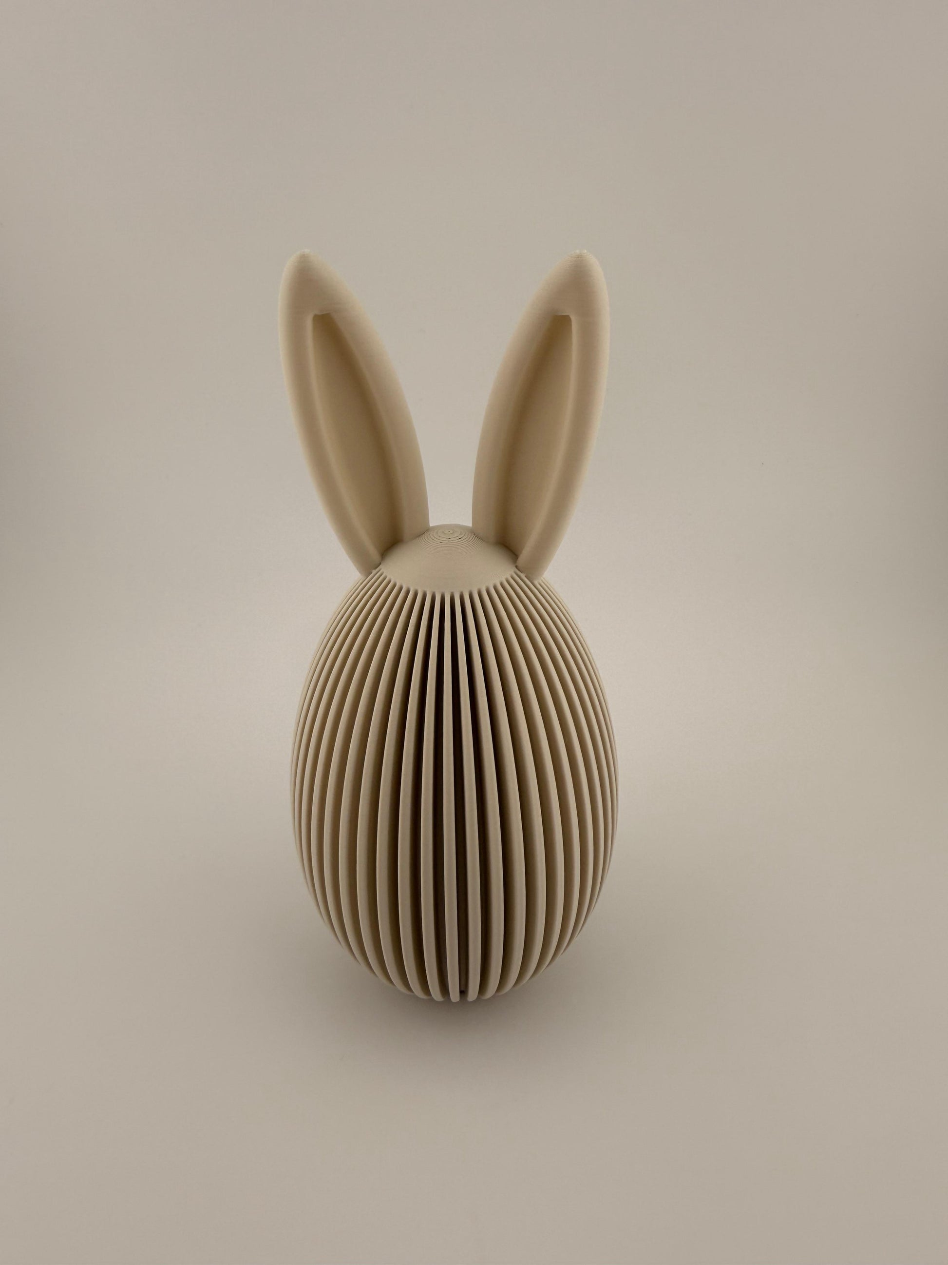 Als Set aus zwei harmonisch abgestimmten Größen wirkt „Eiri“ durch präzise 3D-Druckfertigung zugleich minimalistisch und detailreich. Gemeinsam arrangiert entsteht ein ausgewogenes, modernes Osterensemble – ein stilvoller Blickfang auf Sideboards, Regalen oder Fensterbänken und eine perfekte Ergänzung zu den Hasenfiguren der Nordic-Serie.